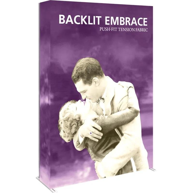 Embrace 5ft Backlit Full Height Push-Fit Tension Fabric Display By ExpoMan – The Embrace™ 5ft full height (2 Quad x 3 Quad) backlit push-fit fabric display is a sleek illuminated collapsible display. The Backlit Embrace makes it simple to make a big impact in minutes with easy-to-attach patent-pending LED lighting and a push-fit backlit graphic that attaches to channel bars around the perimeter of the frame. Simply attach lights to the collapsible frame and insert the graphic into the channel bars for an impactful illuminated display solution! Graphics available as single or double-sided with endcaps. No tools are required for assembly. A protective molded case for storage and transport are included. Option available to purchase frame, LED lights and case only.